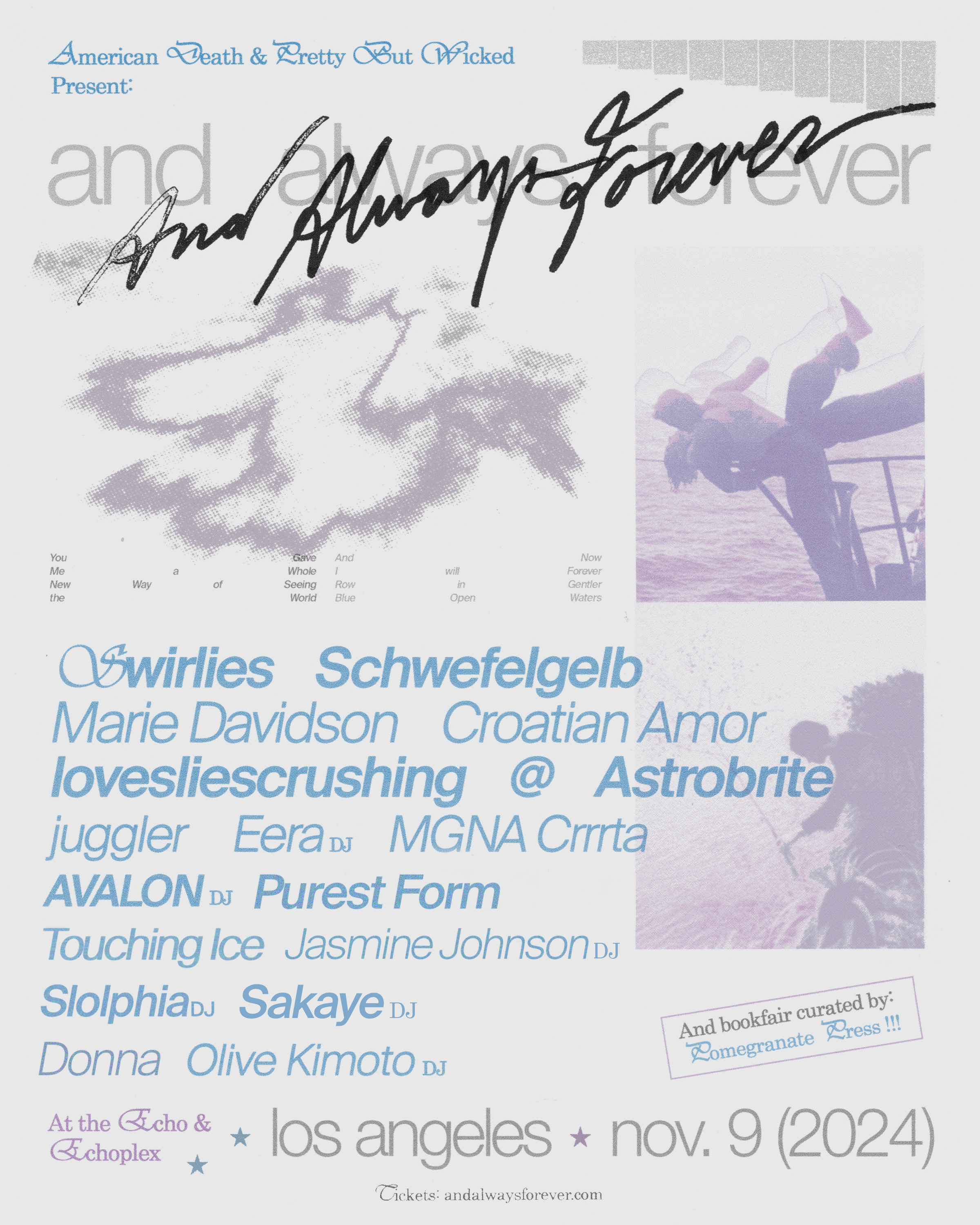 Born with the intention to provide space for both the budding and the long-established musical pioneers of the shoegaze and electro-clash persuasion, And Always Forever is the moment to bask in the accumulated influences that have birthed this eclectic zeitgeist. Witness the reminiscent Swirlies, whose “Two Girls Kissing” is tattooed across the hearts of our collective adolescence. Between harmony and distortion stands Loveliescrushing, and beside them, chosen family Astrobite, blinking and purring among all things lovely.But like everything worthwhile, AAF is dissonant, fast and hard, sexy. It exhales a puff of smoke then inhales the breath of a nearby stranger to the sounds of Schwefelgelb and MGNA Crrrta. Electroclash juxtaposes the soft sparkle of shoegaze, the marriage of the two genres creating soundwaves mimicking death and rebirth, and gifting us with Croatian Amor, returning to the US ten years later on our stage. *tears* In the flurry of these clustered genres' modernities, there is the very intersection that has influenced genre innovators such as Touching Ice, Purest Form, Juggler, Urika’s Bedroom. All in the heart of Los Angeles, where select thousands worship shoegaze, techno, electroclash, and the flutters and pulses in between. Where we have been lucky to find each other. And Always Forever is a single-day love letter whose ink is the showcase of versatility and all-enveloping magic manifested within the artists on its stage. Join us for our inaugural year ;) November 8th, 2024.